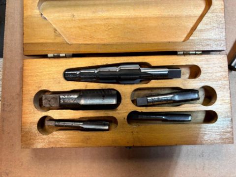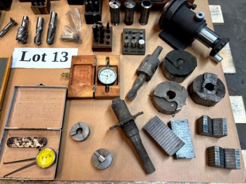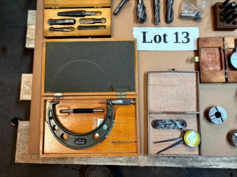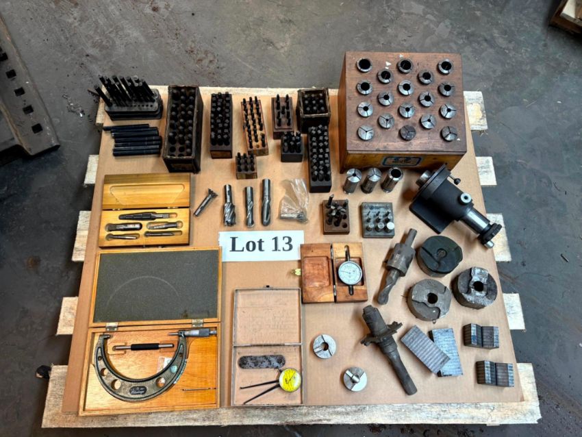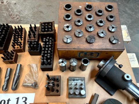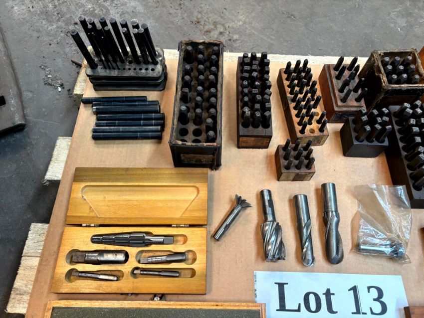 ASSORTED COLLETS, A LOT OF METAL PUNCHING STAMPS, MITUTOYO 5-6” CALIPERS IN BOX, SPARK PLUG KIT IN BOX, AND MORE