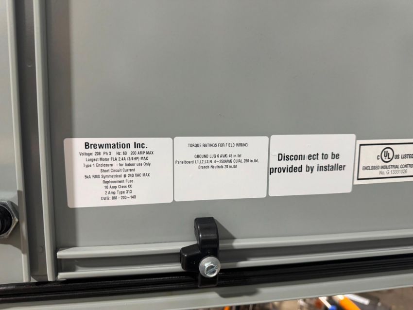 COMPLETE 7 BBL BREWING SYSTEM COMBINING BREWMATION CONTROLS, STOUT TANKS, AND 2024 THERMALINE HEAT EXCHANGE. DESIGNED FOR SEMI-AUTOMATED BREWING ENVIRONMENTS, THIS SYSTEM INCLUDES HLT/KETTLE ELECTRICAL PANELS, CONICAL FERMENTERS, INTEGRATED VFD-DRIVEN PUMPS, AND TRI-CLAMP FLUID TRANSFER. ALL EQUIPMENT SHOWS AS UNUSED, WITH FULL FACTORY DOCUMENTATION AND LABELED ENCLOSURES, IDEAL FOR CRAFT BREWING STARTUPS OR EXPANSION PROJECTS..
